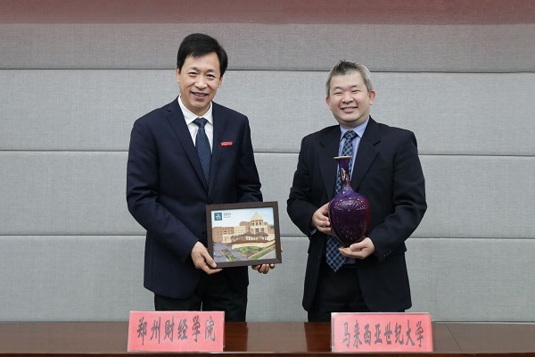 校长于向英和马来西亚世纪大学副校长Norman Chu签署了《郑州财经学院与马来西亚世纪大学合作备忘录》。随后理事长牛钦民和Norman Chu副校长互赠礼物表达祝福并合影留念。